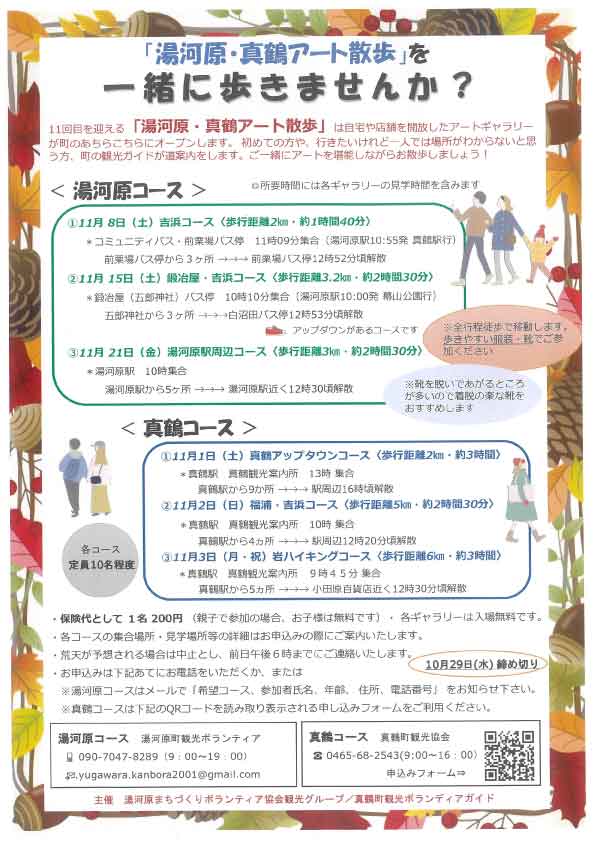 今年第11回を迎える「湯河原・真鶴アート散歩」は自宅や店舗を開放したアートギャラリーが町のあちらこちらにオープンします。初めての方や、行きたいけれど一人では場所がわからないと思う方、町の観光ガイドが道案内をします。ご一緒にアートを堪能しながらお散歩しましょう!