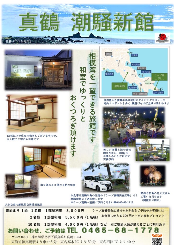 相模湾を望めるくつろげる和室の旅館です。冷暖房、TV完備、お食事は真鶴半島の先端のケープ真鶴美食広場で海を眺めながら、バーベキュー、海鮮浜焼き、牡蠣料理などをお楽しみ頂けます。