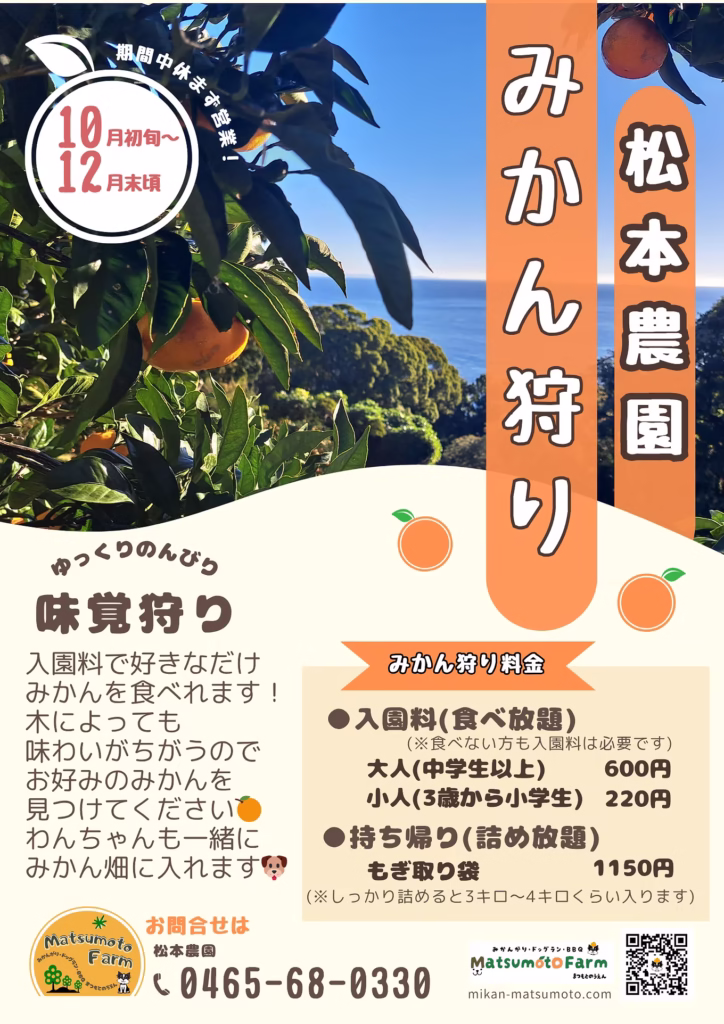 今年も松本農園でのみかん狩りが開始されました!自然に寄り添い安心安全を大切に育てたみかんを楽しむことができます。また、みかん狩り以外にもドッグラン、BBQなどが楽しめます。